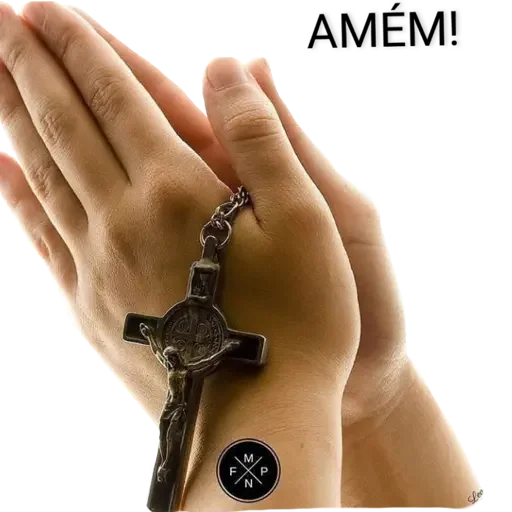 Mãos juntas em oração com um crucifixo e a palavra 'AMÉM!'