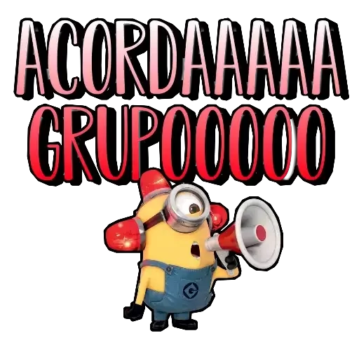 Um Minion amarelo com um olho grande e roupas azuis e laranja, segurando um megafone e fazendo barulho, com o texto 'ACORDAAAAA GRUPOOOOO' em letras grandes e coloridas.