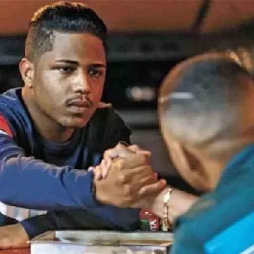 Dois homens sentados à mesa, com as mãos dadas e olhando um para o outro. O homem à esquerda tem cabelo curto e veste uma camisa azul com manga longa e um ombro descoberto.