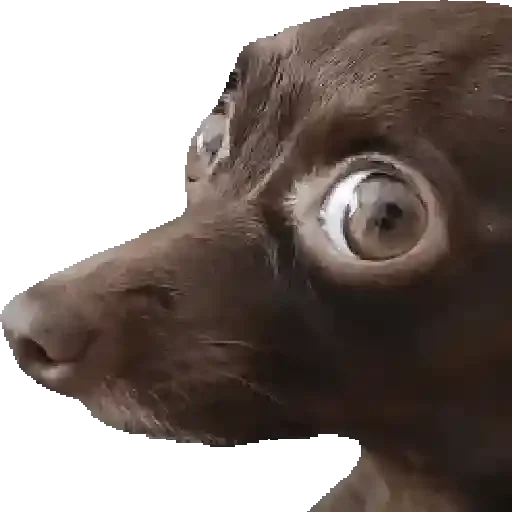 Cachorro com expressão surpresa, olhos arregalados e focados para a esquerda, com focinho e orelhas marrons.