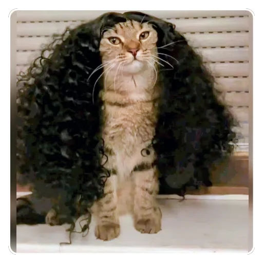 Gato com peruca preta cacheada, parecendo uma cabeleira, com expressão séria e olhos castanhos. O gato tem manchas marrons e é da raça tabby.
