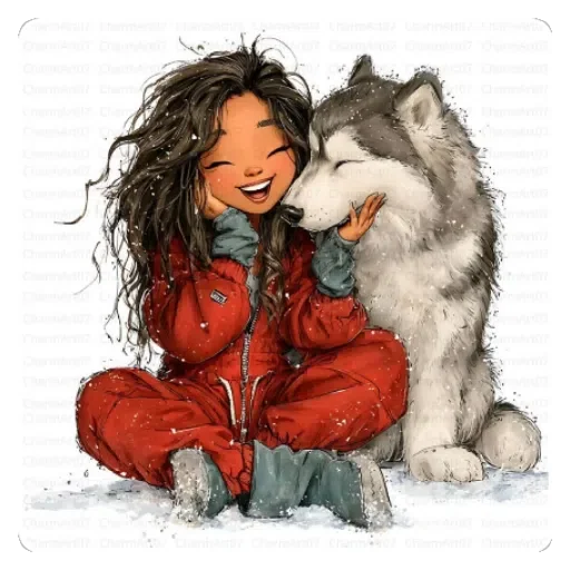 Menina com cabelo castanho escuro e macarrão vermelho sentada na neve ao lado de um cachorro cinza e branco que a beija no rosto.