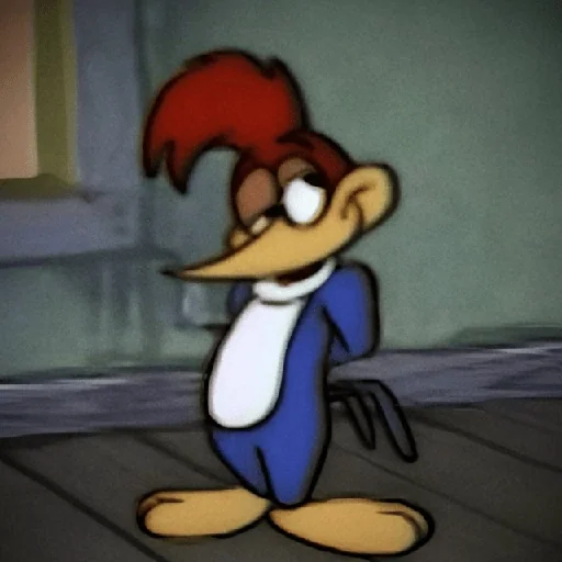 Personagem de desenho animado com penas marrons e vermelhas, bico laranja, usando um macacão azul e com expressão surpresa.