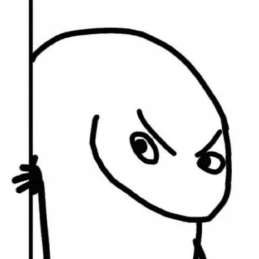 Um personagem de desenho simples com expressão de desconfiança ou raiva, feito com linhas pretas grossas.