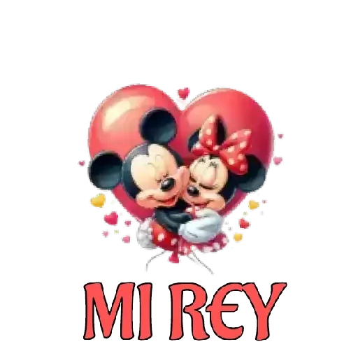 Mickey e Minnie Mouse se abraçando dentro de um coração vermelho gigante, com texto 'MI REY' em vermelho abaixo.