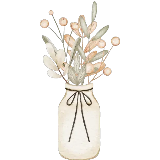 Um vaso de vidro com um laço preto, cheio de flores e folhas em tons de bege e verde.