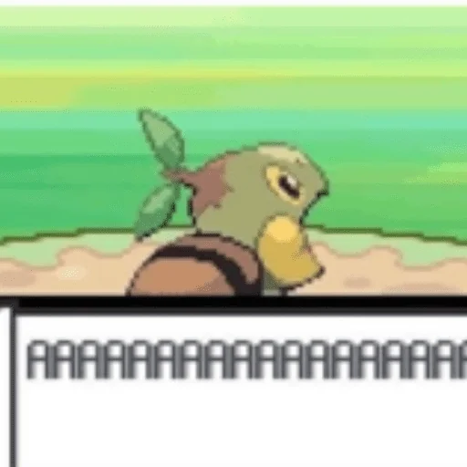 Um Pokémon parecido com um caracol, com uma concha marrom e um corpo verde-amarelado, está em uma superfície de terra com fundo verde.