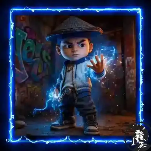 Menino de anime com expressão séria, usando um chapéu e com uma aura de eletricidade azul ao redor de suas mãos, em um cenário urbano noturno com grafites.