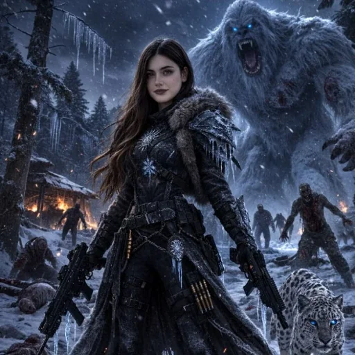 Uma mulher com cabelos castanhos longos e armadura preta enfrenta um grande monstro cinza em um cenário de neve e escuridão, com pessoas ao fundo em uma vila em chamas.