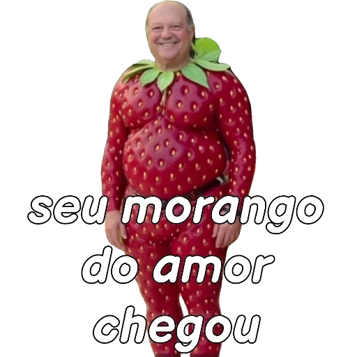 Um homem gordo vestindo um macacão de morango com folhas verdes no pescoço. Sobreposto, o texto 'seu morango do amor chegou'.