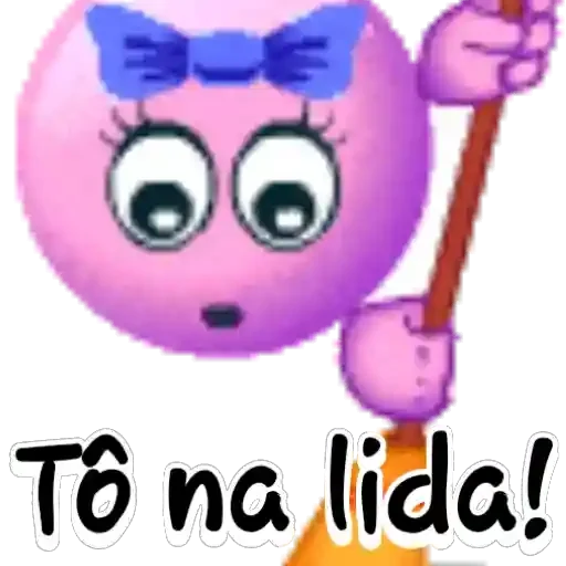 Uma personagem de desenho animado rosa com laço roxo no cabelo e expressão surpresa, segurando um objeto laranja e amarelo, com o texto 'Tô na lida!'