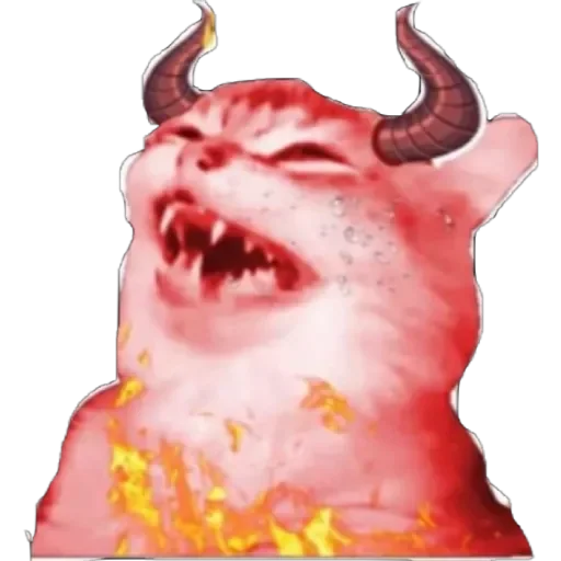 Um demônio rosa com chifres e olhos fechados, boca aberta com dentes afiados, corpo em chamas.