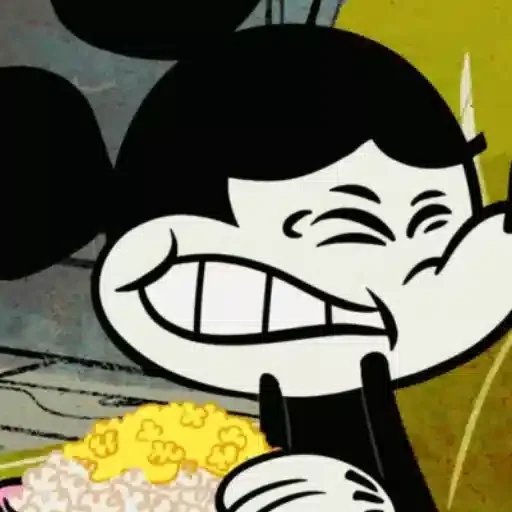 Rosto de Mickey Mouse com expressão curiosa, fundo marrom com sombra.
