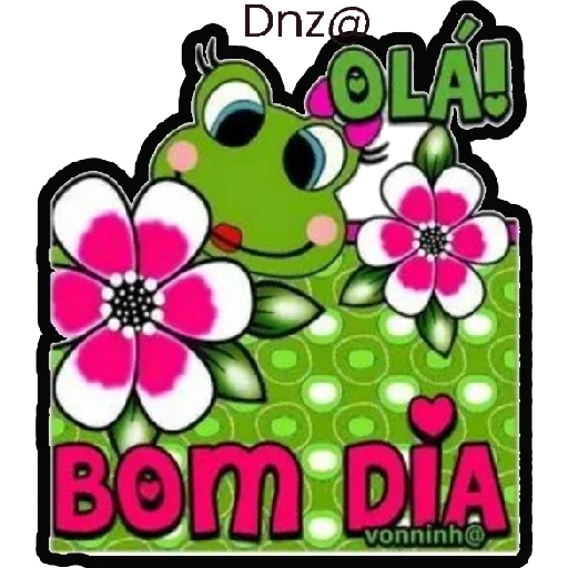Um sapo verde com olhos grandes e rosados, sorrindo, ao lado de flores rosa e brancas, com o texto 'OLÁ!' em verde e 'BOM DIA' em rosa.