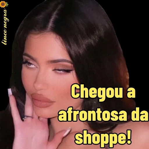 Uma mulher com cabelo escuro e unha comprida fazendo um gesto com a mão, com o texto "Chegou a afrontosa da shoppe!" sobreposto em amarelo.