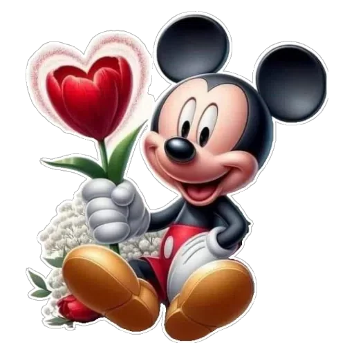 Mickey Mouse sorri e segura um buquê de flores com um coração vermelho. Ele está usando suas roupas clássicas.