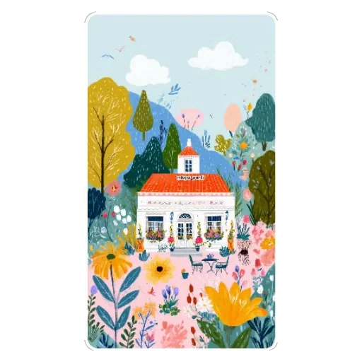 Uma casa branca com telhado laranja em um jardim florido com montanhas ao fundo.