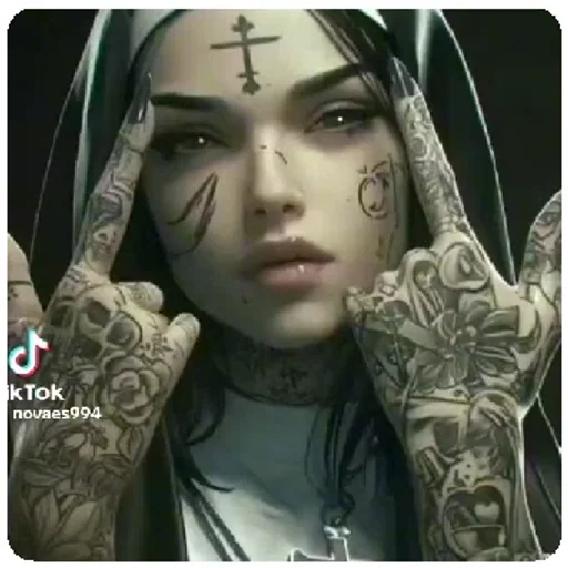 Uma mulher com tatuagens e marcas no rosto e nas mãos, vestindo uma roupa branca e com um crucifixo na testa, ao lado de um logotipo do TikTok.