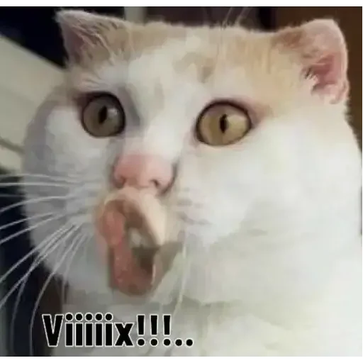 Gato branco com a língua para fora e olhos amarelados, parecendo surpreso ou confuso. A imagem tem o texto 'Viiiiix!!!' na parte inferior.
