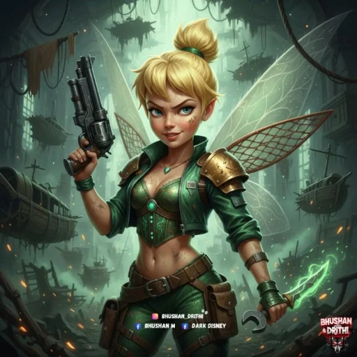 Uma mulher com cabelo loiro preso em um coque, usando um traje verde e com asas de borboleta nas costas, segura uma arma na mão direita e uma lâmina verde na esquerda, em um cenário sombrio e pós-apocalíptico.