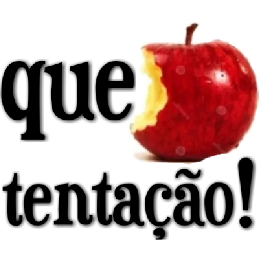 Uma maçã vermelha mordida com o texto 'que tentação!'