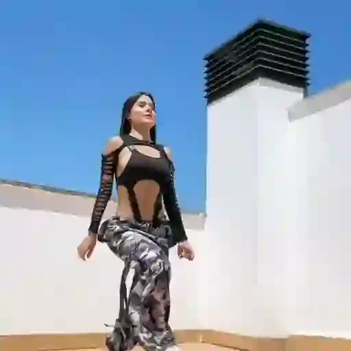 Mulher de meia-noite com roupas pretas e brilhantes, dançando em frente a uma parede branca e um céu azul.