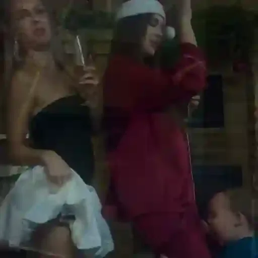 Duas mulheres dançando, uma de vestido preto e outra de robe vermelho e touca branca, em um ambiente noturno.