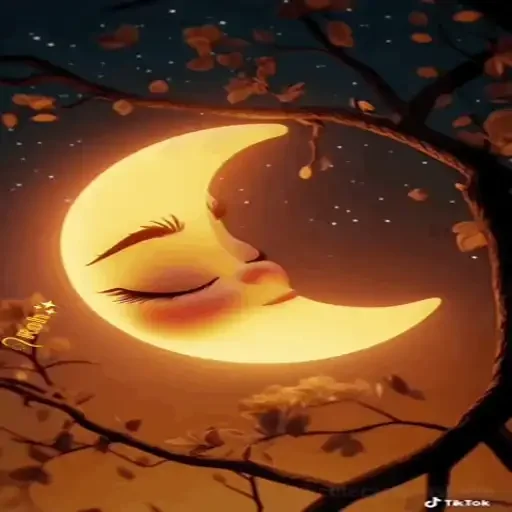 Lua crescente com rosto de mulher, olhos fechados, sonhando. Folhas ao redor e fundo noturno.