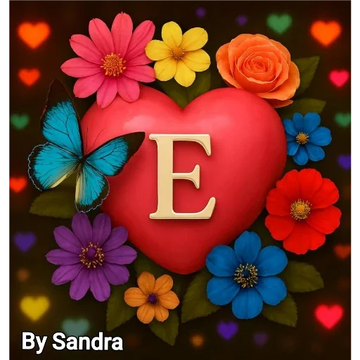 Um coração vermelho grande com a letra 'E' no centro, rodeado de flores coloridas e borboletas. Fundo escuro com corações e flores.