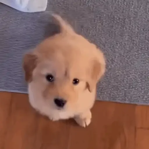 Um filhote de cachorro fofo com pelo bege e olhos castanhos olha para cima, com o rabo levantado, em um piso de madeira e tapete cinza.