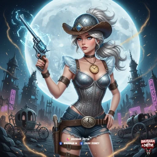Uma mulher com cabelos grisalhos e um chapéu de cowboy segura uma arma em frente à lua cheia. Ela veste um traje metálico e uma roupa íntima prata com uma fivela dourada.