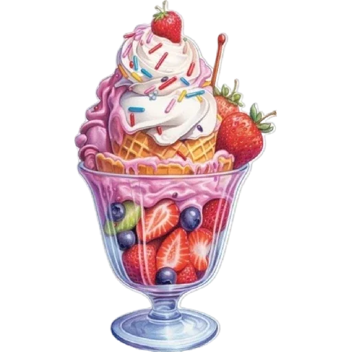 Um sorvete de morango em um copo alto, decorado com morangos, mirtilos e confeites coloridos.
