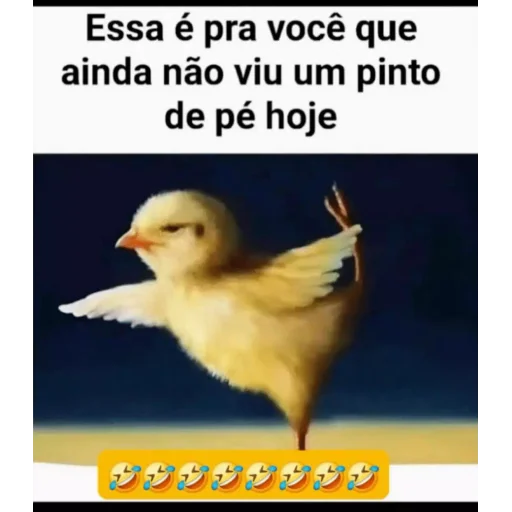 Um filhote de pato ou galinha com expressão séria, em pose de voo, com texto 'Essa é pra você que ainda não viu um pinto de pé hoje'.