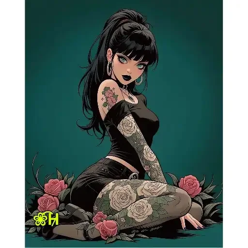 Uma mulher com cabelo preto e tatuagens sentada entre rosas, vestindo roupas pretas. Ela tem uma expressão sensual e os braços tatuados.