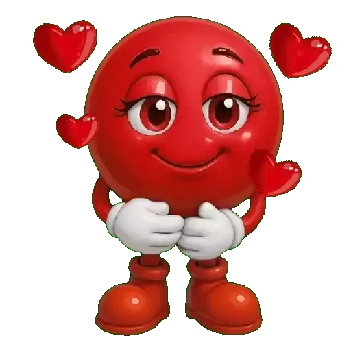 Uma personagem de desenho animado, uma esfera vermelha com olhos grandes e um sorriso, rodeada de corações vermelhos. Ela tem luvas brancas e sapatos vermelhos.