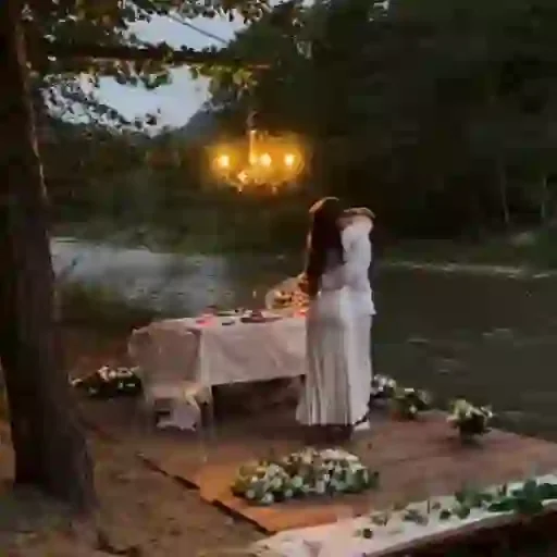 Casal se beijando em um cenário romântico ao ar livre, com uma mesa decorada e flores no chão, sob um candelabro aceso.