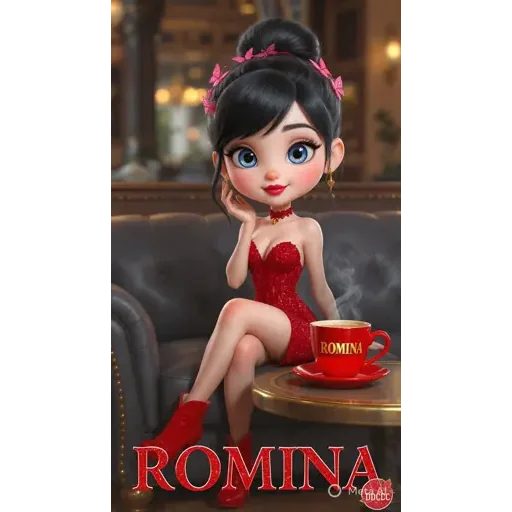 Uma mulher de anime com cabelo preto e vestido vermelho sentada em um sofá com uma xícara de café. Ela tem uma faixa rosa no cabelo e diz 'ROMINA' em letras vermelhas.