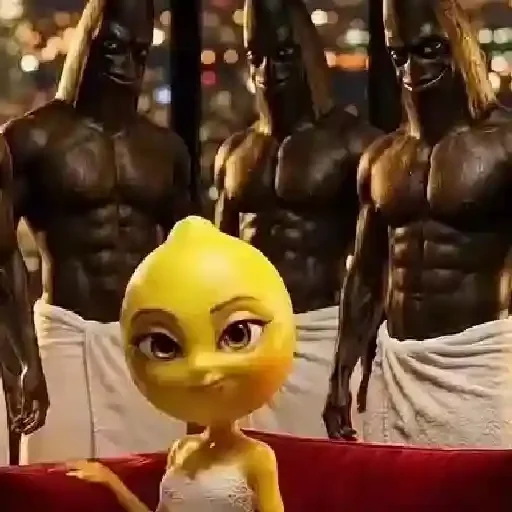 Uma figurinha de uma menina amarela com vestido branco sentada em um sofá vermelho, com três homens musculosos e sem camisa ao fundo.