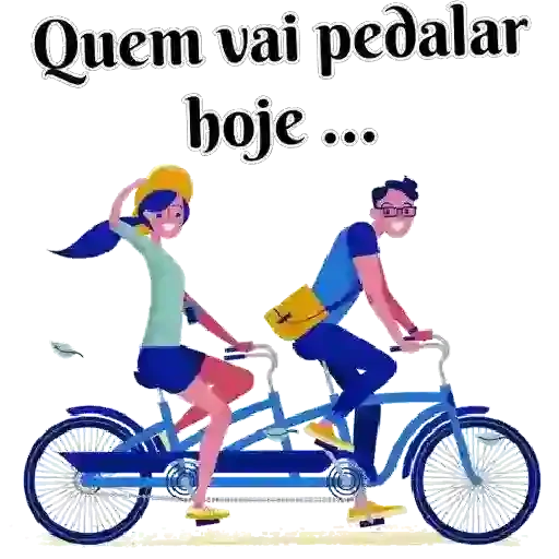 Um casal em uma bicicleta tandem, com o homem ao lado direito e a mulher ao lado esquerdo. Ele está usando óculos e uma bolsa amarela. A mulher tem o cabelo azul e está com um capacete amarelo. O texto 'Quem vai pedalar hoje ...' está acima deles.