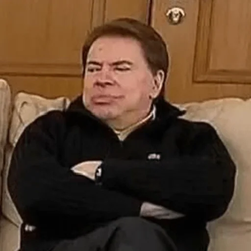 Homem com expressão séria, braços cruzados e sentados em um sofá bege, com uma porta de madeira ao fundo.
