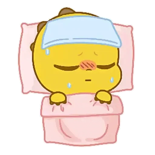 Um desenho de um pato amarelo deitado na cama, com um pano azul na testa e suor no rosto.