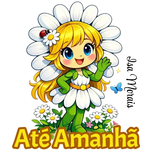 Uma menina de cabelos loiros com uma flor na cabeça e um vestido de flor, com a inscrição 'Até Amanhã' embaixo. Ela está sorrindo e acenando com a mão.