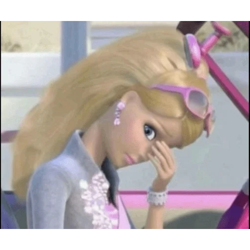 Uma menina loira com óculos de sol rosa está com a mão no rosto, parecendo preocupada ou confusa.