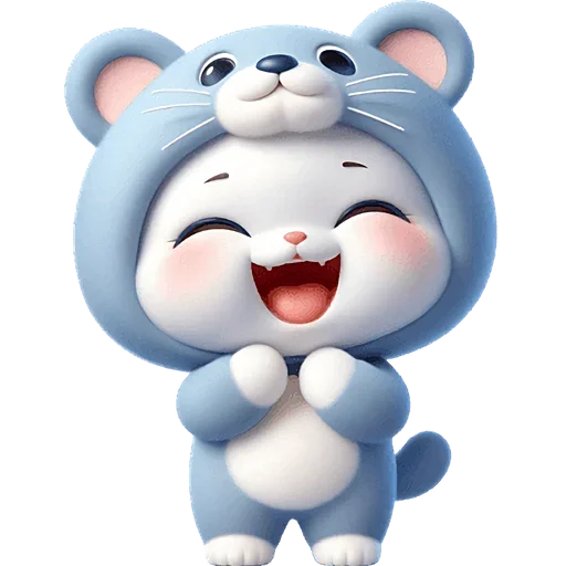 Um personagem de desenho animado de um gato azul com olhos fechados e sorriso largo, usando uma fantasia de gato, com as mãos juntas na frente.