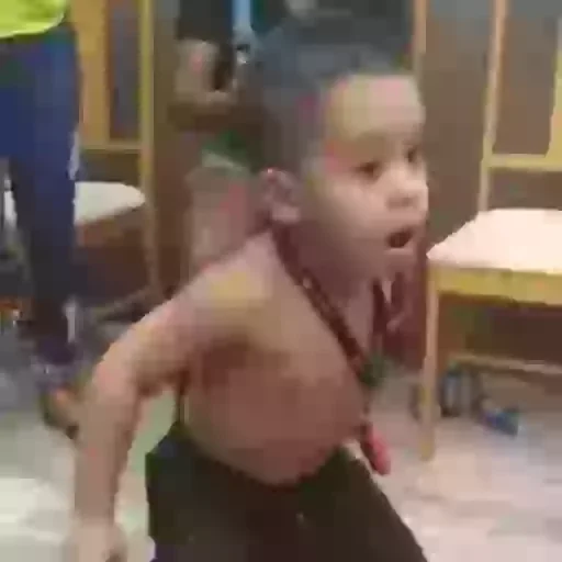 Menino asiático com expressão de surpresa ou dor, sem camisa e com um colar ao pescoço, em um ambiente com cadeiras ao fundo.