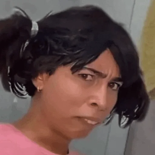 Rosto de uma menina com expressão facial séria, cabelo castanho escuro preso em um coque duplo e vestindo uma blusa rosa.