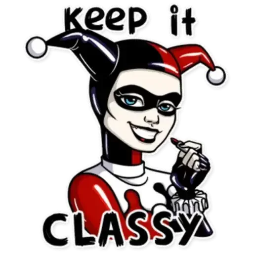 Harley Quinn, caracterizada com maquiagem branca e preta, usando um chapéu de bobo da corte vermelho e preto, com os dizeres 'Keep it' na parte superior e 'CLASSY' na inferior.