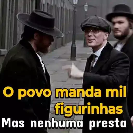 Três homens de terno e chapéu conversam em uma rua. O texto 'O povo manda mil figurinhas Mas nenhuma presta' aparece em destaque.