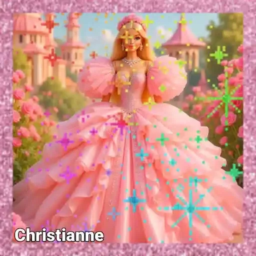 Uma mulher loira vestida com um vestido rosa em um cenário de castelo e jardim, com estrelas coloridas ao redor. O nome 'Christianne' aparece no canto inferior esquerdo.