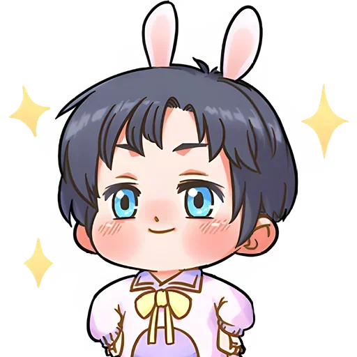 Personagem de anime com orelhas de coelho, cabelo preto e olhos azuis, usando um casaco roxo e amarelo com estrelas douradas ao fundo.